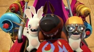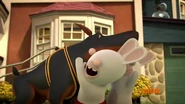 In Dueling Rabbids. He teamed up with the third rabbid to save the second and first from Mona and her dog Fifi. At the end he scares off Fifi and Mona and latter charges with his friend rabbid at the first one.