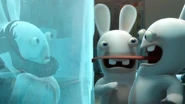 The Rabbids encountered there ancestor frozen in a block of ice.They managed to unfreeze him, but he is shown to be smarter, shorter and has a deeper voice. After a few tries of showing intelligence, he became sad because of his predcesor's stupidly, to cheer him up. They froze themselves in a freezer, while he created a washing machine and traveled through time with it.The two men that found the ancestor came back and saw the frozen Rabbids.